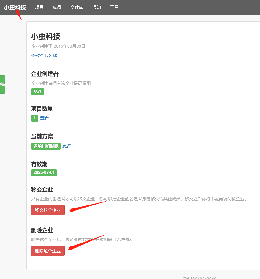 如果您是当前企业的创建者,您可以点击下方图片中的企业名称,在弹出的页面中,选择删除企业或者移交企业。